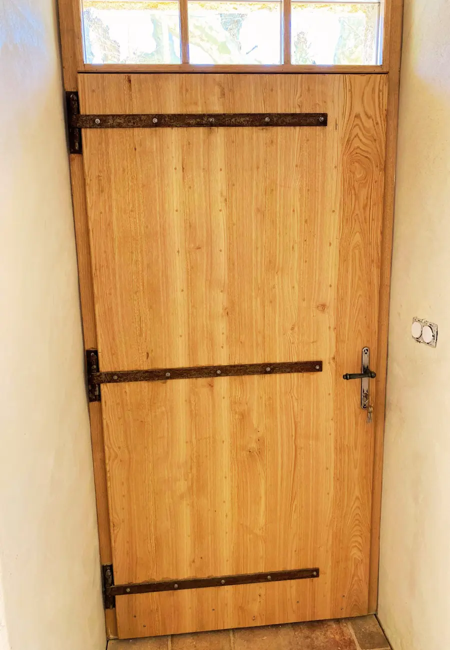 Réalisation dans la région du Gard d’une porte pleine en bois massif, équipée de trois pentures horizontales métalliques et surmontée d’une imposte vitrée.