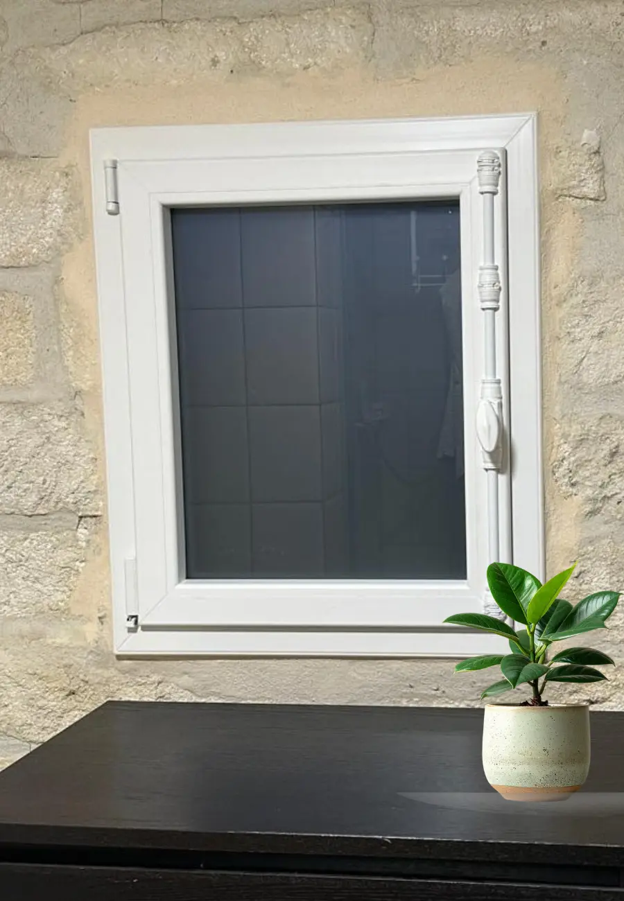Installation d’une fenêtre en PVC blanc finition imitation bois, réalisée dans la région d’Orange, alliant esthétique traditionnelle et performance moderne.