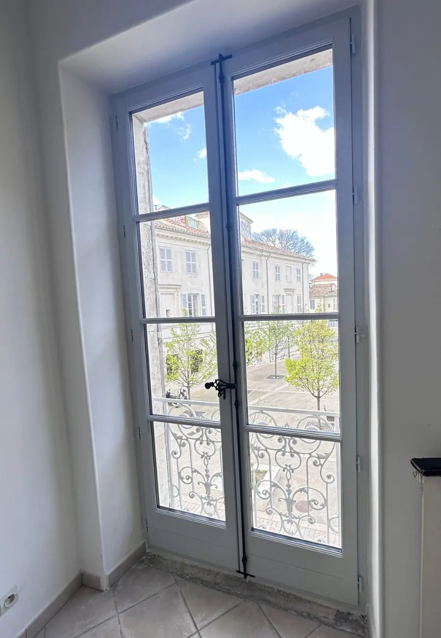Au cœur de Nîmes, cette rénovation allie respect du patrimoine et confort moderne. Les anciennes portes-fenêtres ont été remplacées par des menuiseries bois double vitrage, dans une teinte conforme aux exigences locales.