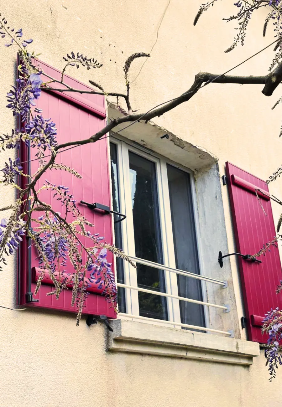 À Anduze, les anciens volets en bois, fortement dégradés, ont été remplacés par des volets en aluminium de couleur rouge, apportant à la fois modernité, durabilité et caractère à la façade.